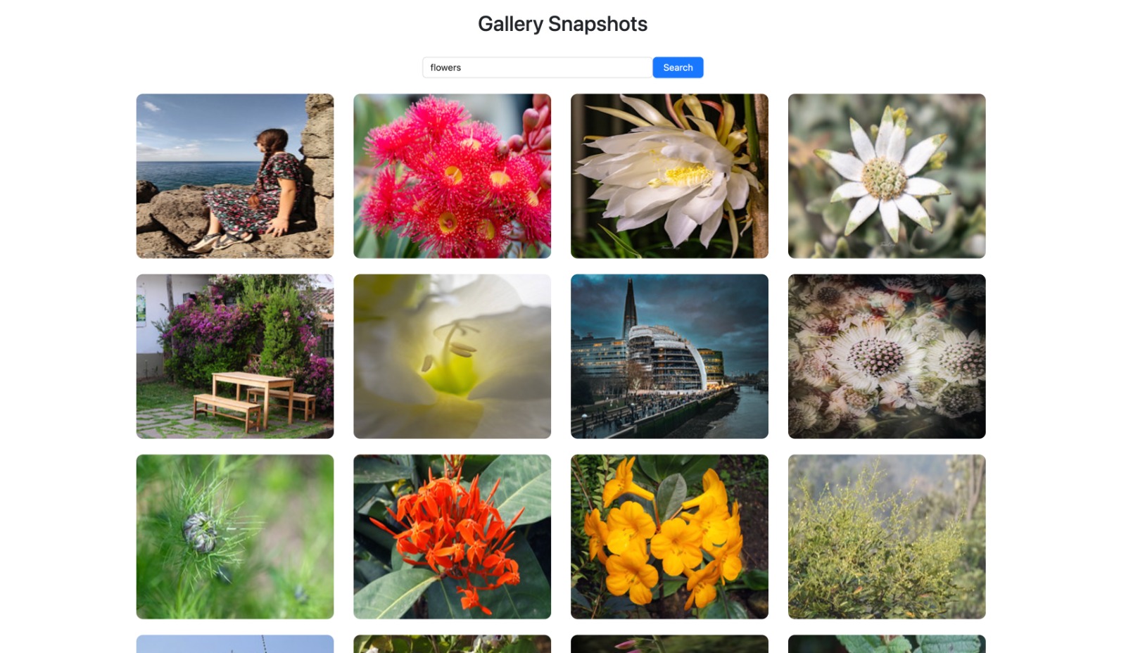 • Developed the dynamic web application "Gallery Snapshots" using React JS, Bootstrap, and Ant Design. • Implemented a search functionality allowing users to find related images by querying an external API. • Integrated Axios for efficient data fetching, providing real-time results based on user input.