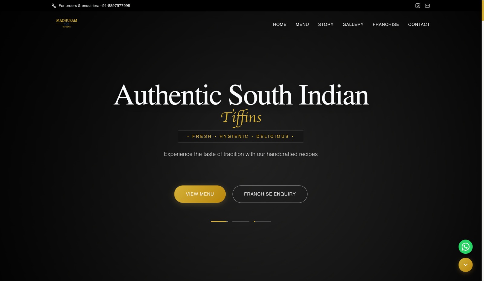 • A premium South Indian cuisine website showcasing authentic tiffins with a modern and appetizing design. • Features a comprehensive menu display with high-quality visuals of items like Idly, Dosa, and Specials. • Includes detailed sections for "Our Story", "Outlets" (Hyderabad, Indore), and "Franchise Enquiry". • Built for a seamless user experience with responsive layout and clear navigation.