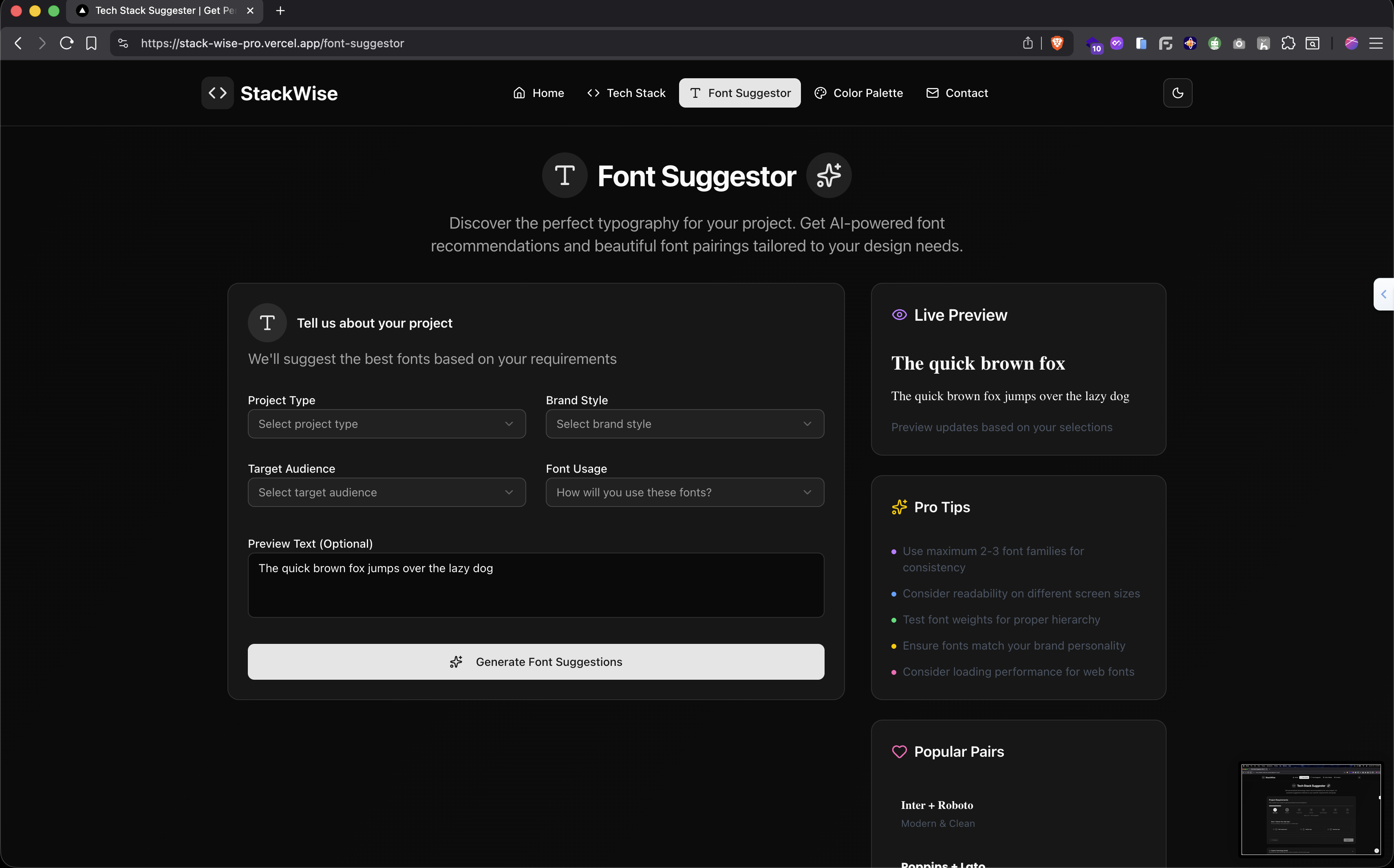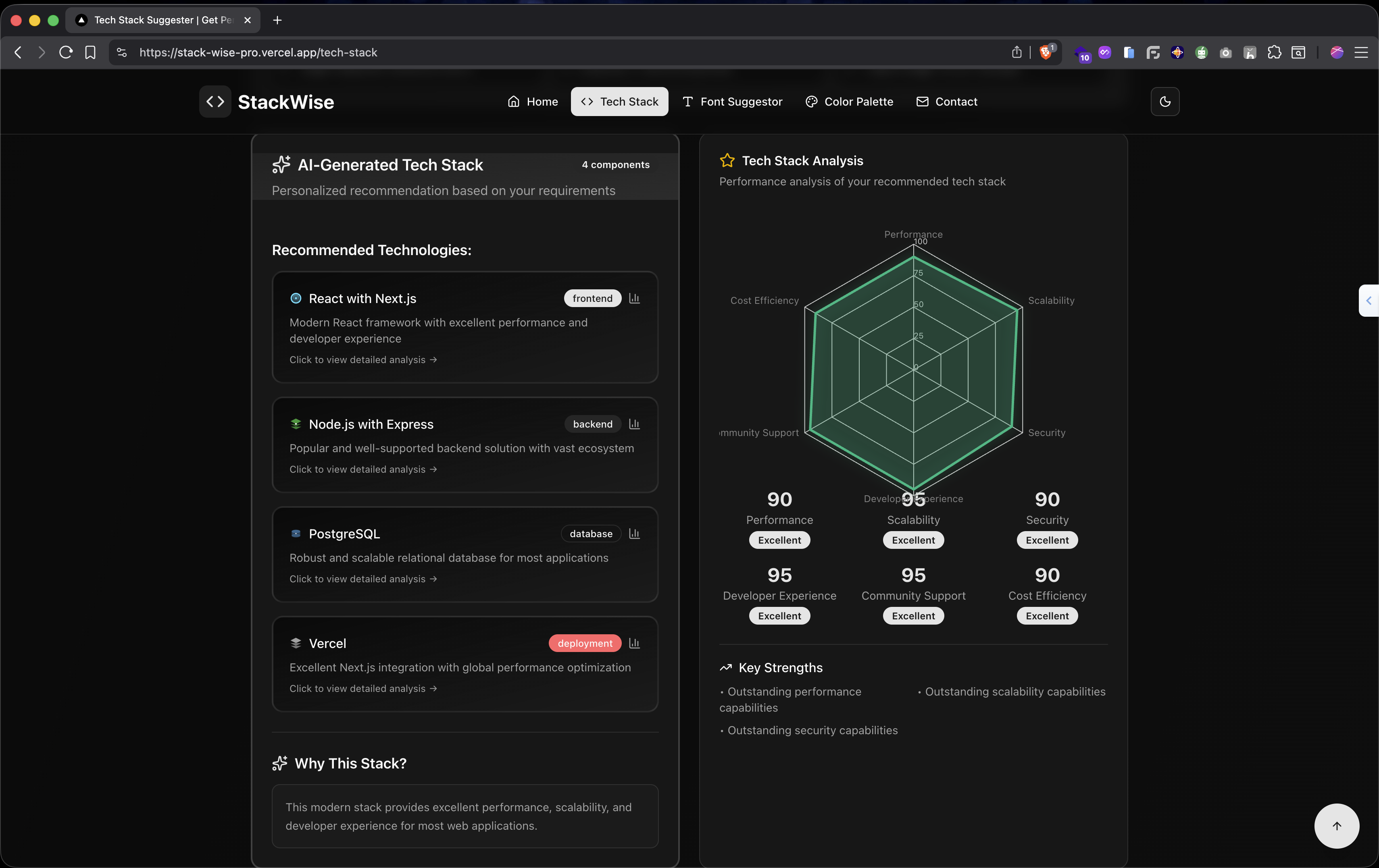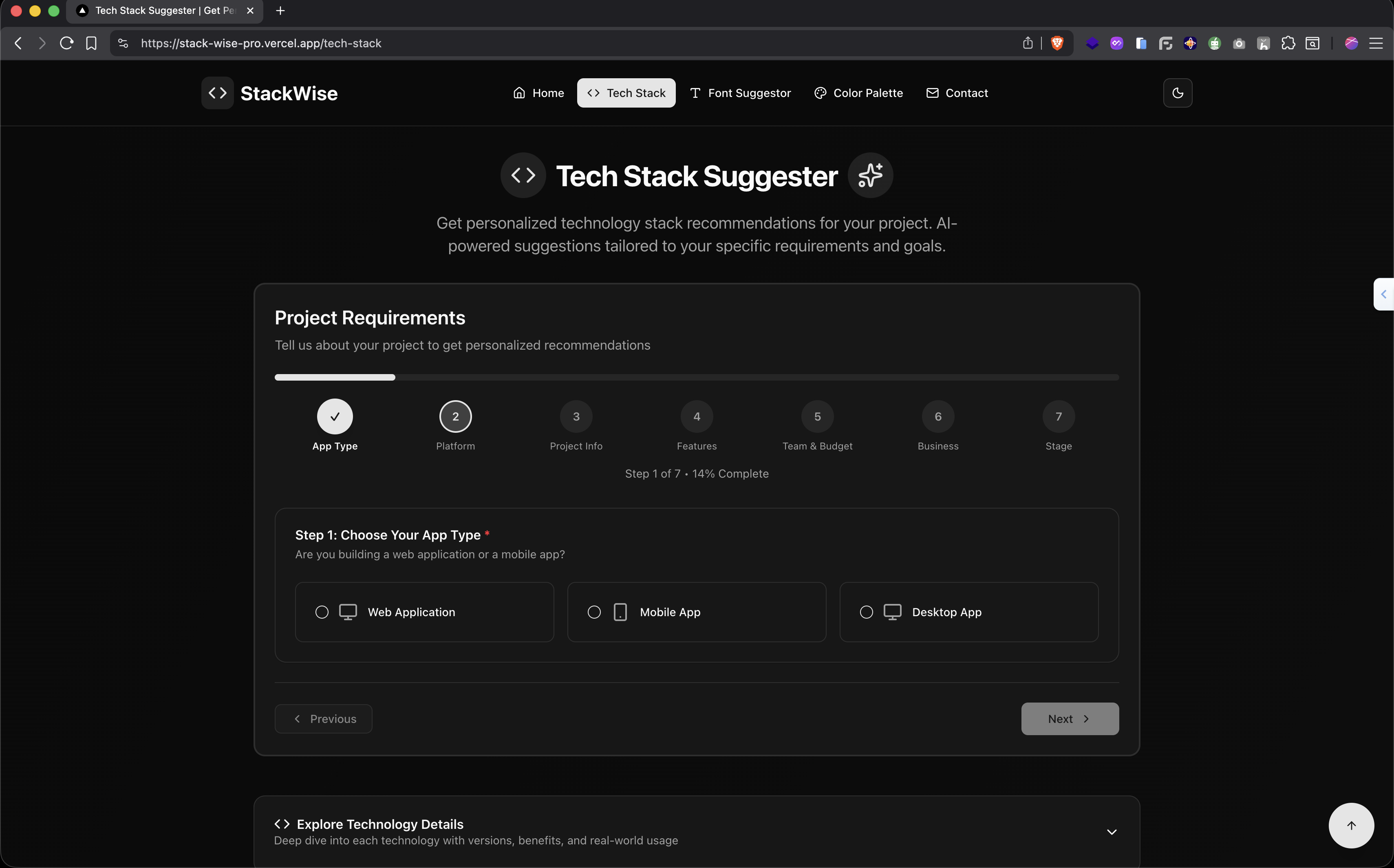• AI-powered tool that analyzes project requirements to provide personalized technology stack suggestions for developers and businesses. • Built with Next.js 15, React 19, and TypeScript featuring a modern UI with shadcn/ui components and Tailwind CSS 4. • Integrated Google Gemini AI for intelligent recommendations with fallback support and comprehensive search options (Basic, Advanced, Wild). • Responsive design with dark/light mode toggle, SEO optimization, and works perfectly on desktop and mobile devices. • Step-by-step form with conditional logic supporting web and mobile app development with detailed feature selection.