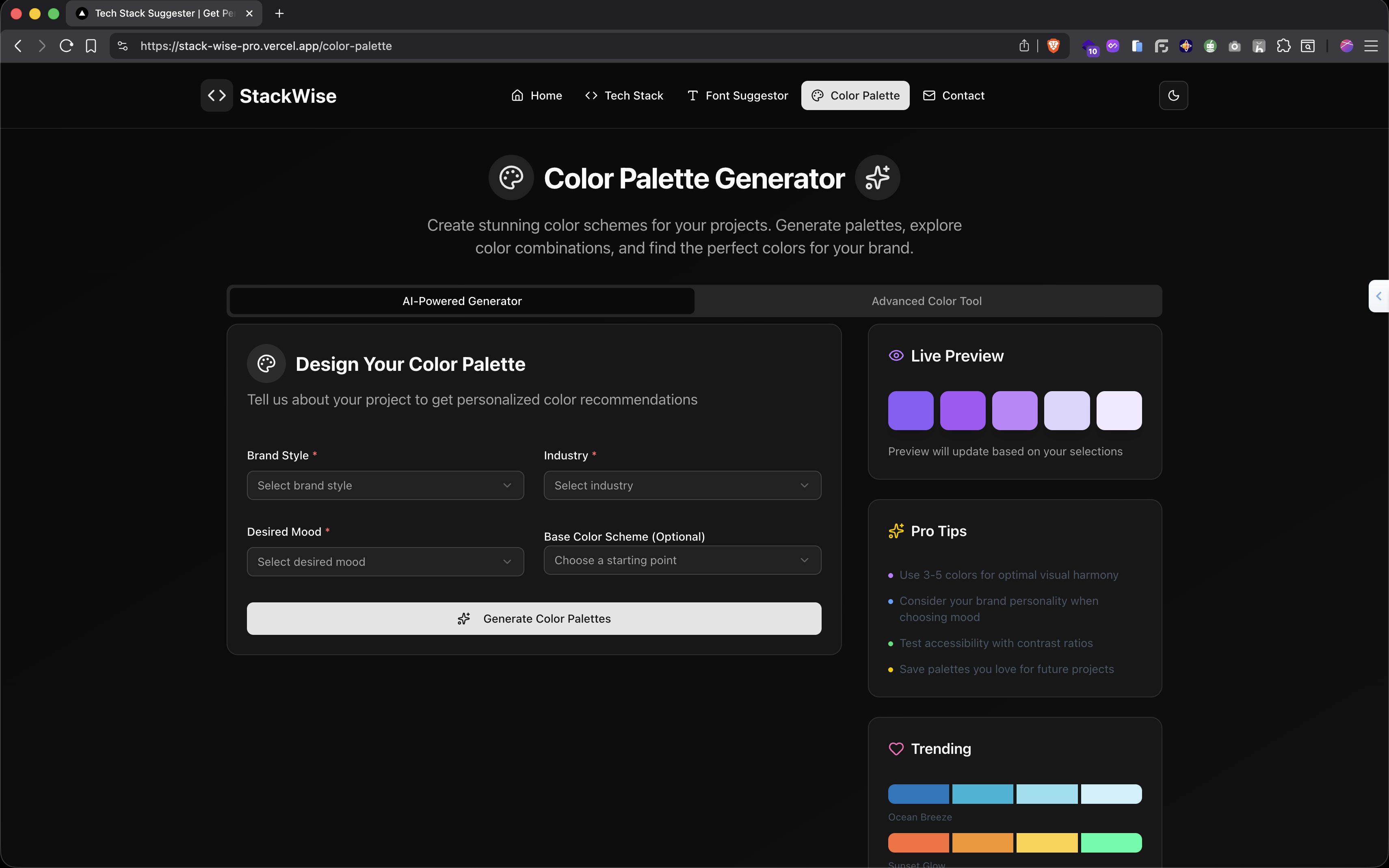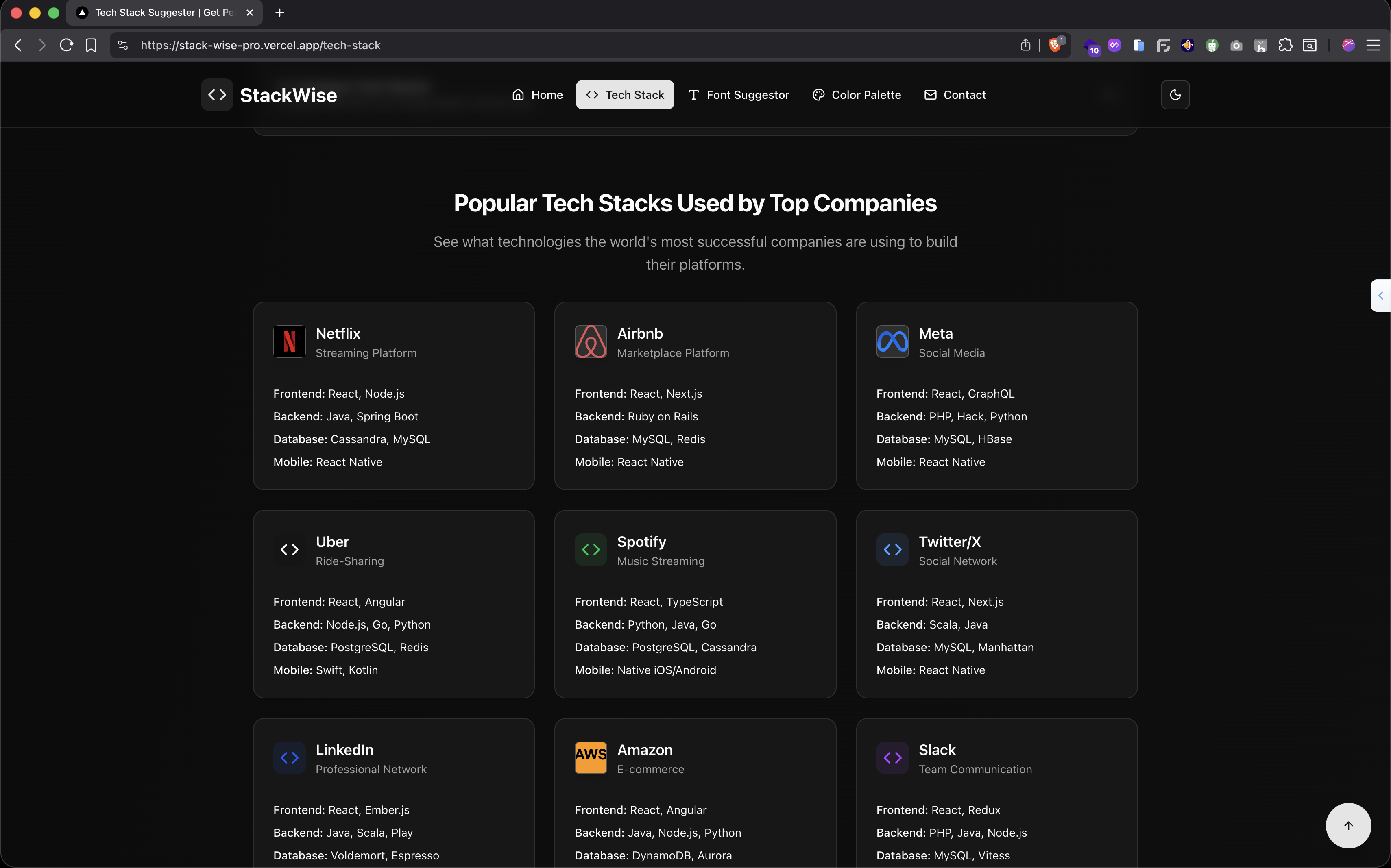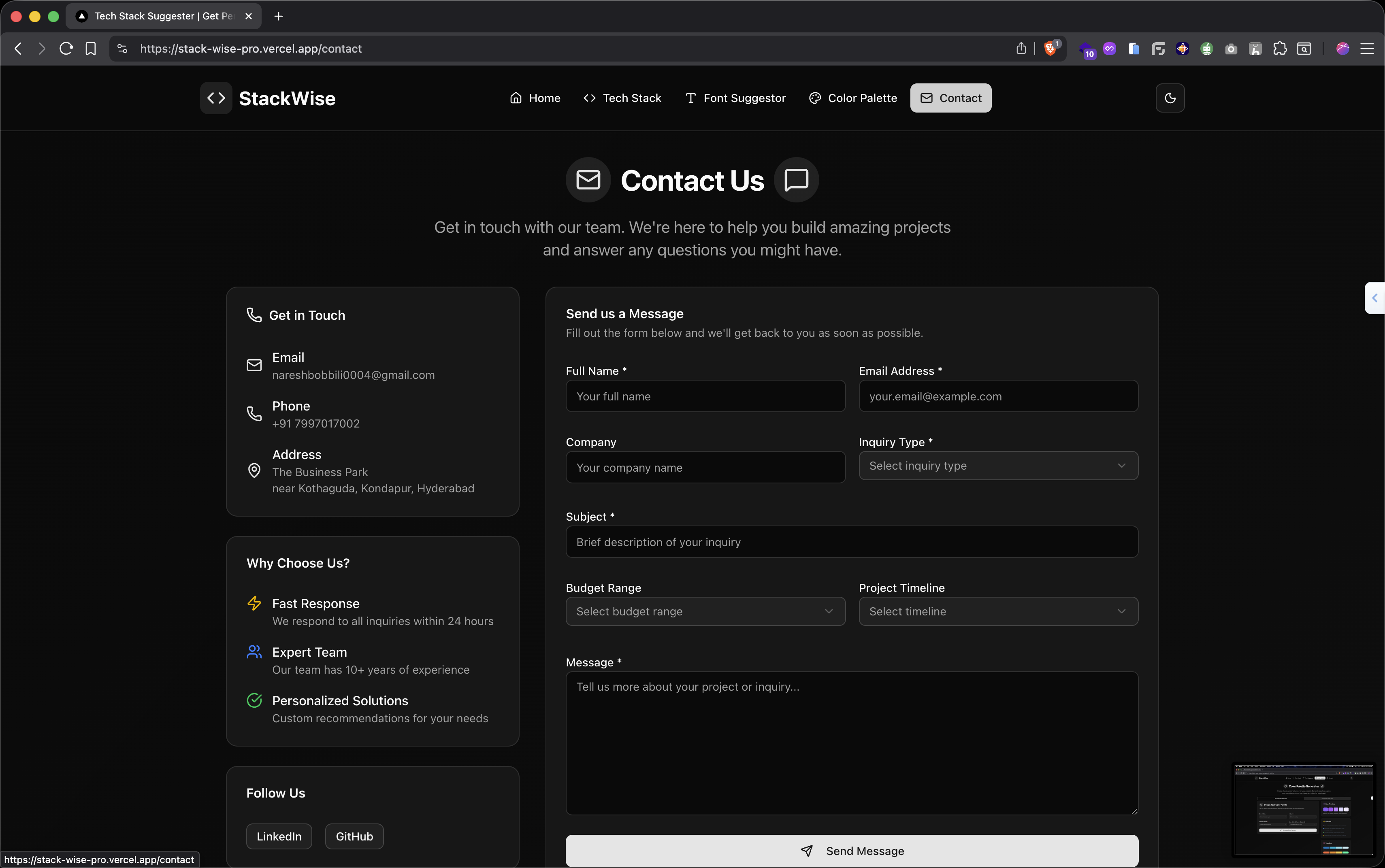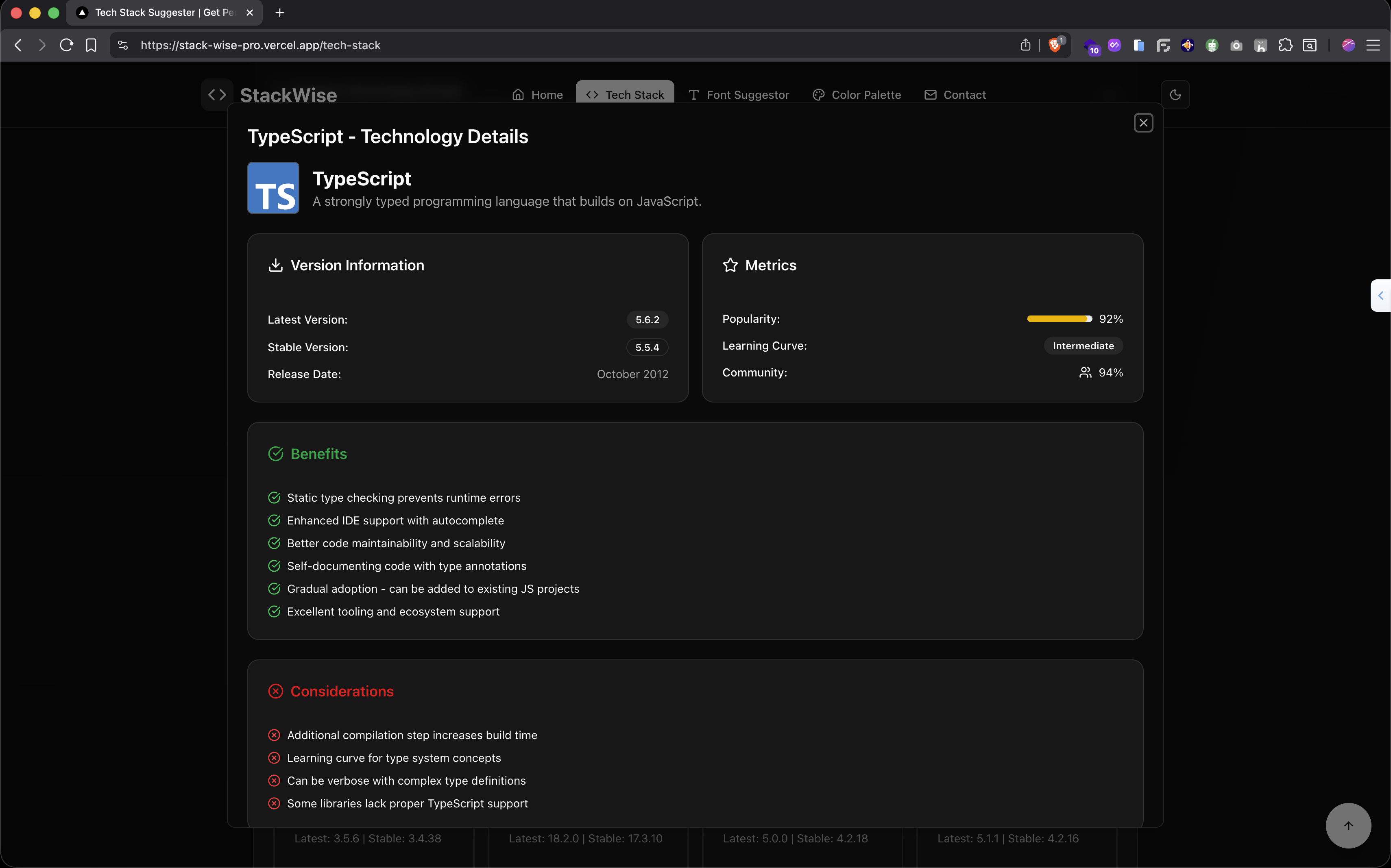 • AI-powered tool that analyzes project requirements to provide personalized technology stack suggestions for developers and businesses. • Built with Next.js 15, React 19, and TypeScript featuring a modern UI with shadcn/ui components and Tailwind CSS 4. • Integrated Google Gemini AI for intelligent recommendations with fallback support and comprehensive search options (Basic, Advanced, Wild). • Responsive design with dark/light mode toggle, SEO optimization, and works perfectly on desktop and mobile devices. • Step-by-step form with conditional logic supporting web and mobile app development with detailed feature selection.